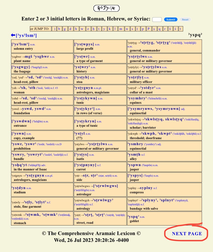 First, I had to dissect the 3 different variations and partially type them into the Comprehensive Aramaic Lexicon (CAL) 3 letters at a time. Here’s some screenshots of my method below: