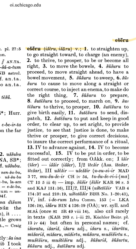 If you look closely at the last screenshot you can see deeper roots of this variation that stems back to Assyrian, Akkadian, and Babylonian. The one in particular that I want you to pay attention to is the Assyrian word: iΕ‘ar | Pronunciation: “EE-SH-AR” | The i (“EE”) can be easily interchangeable with a Y (“EE”) and if you switch the letters a and r it will result in iΕ‘ra or YΕ‘ra. This word is in correlation with another word: eΕ‘heru (The Assyrian Dictionary of the Oriental Institute of the University of Chicago [CAD] Vol. 4, E pg. 352)