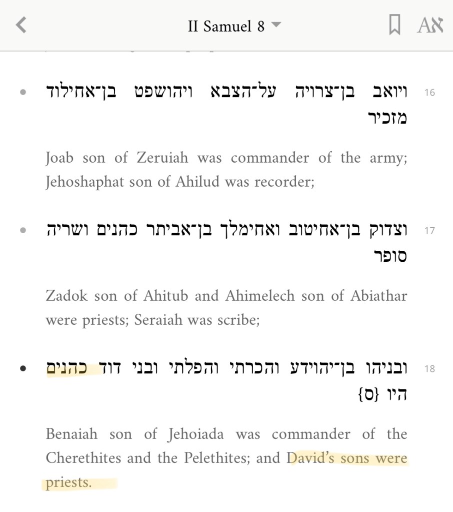 When we read 2nd Samuel 8:18 in the Tanakh we see that King David’s son’s became priests. One might strike the question: Wasn’t the priesthood of Israel strictly reserved for the Levites? The short answer is β yes.
