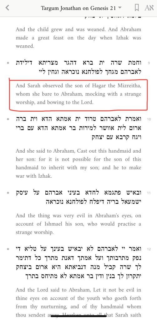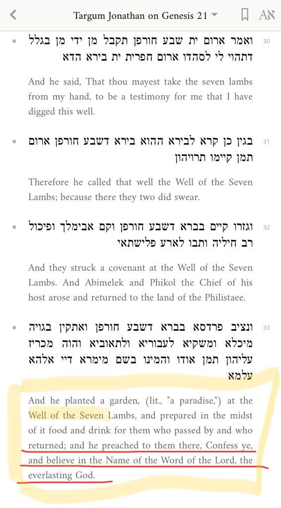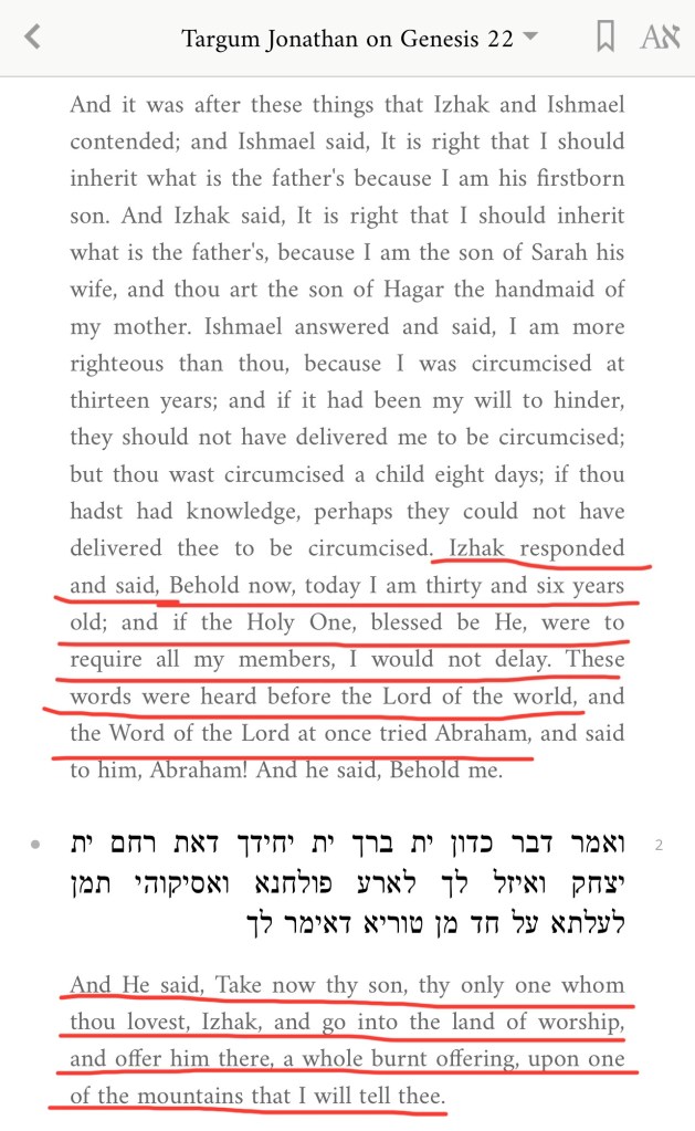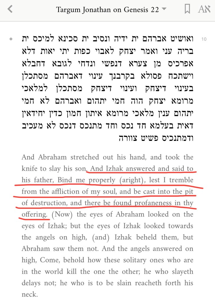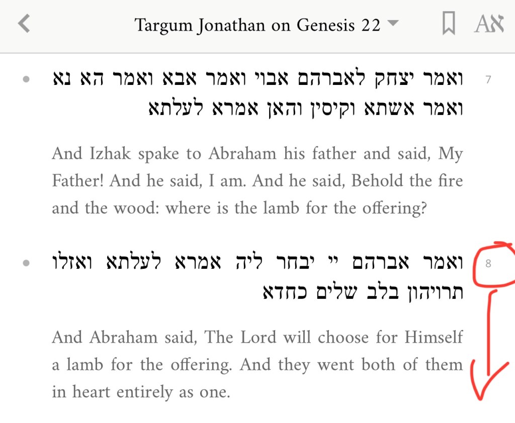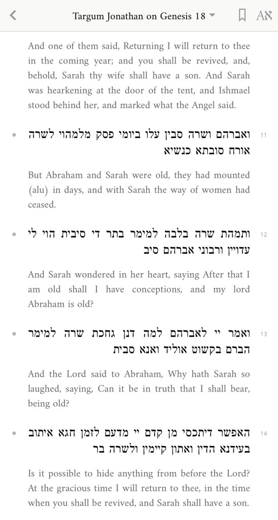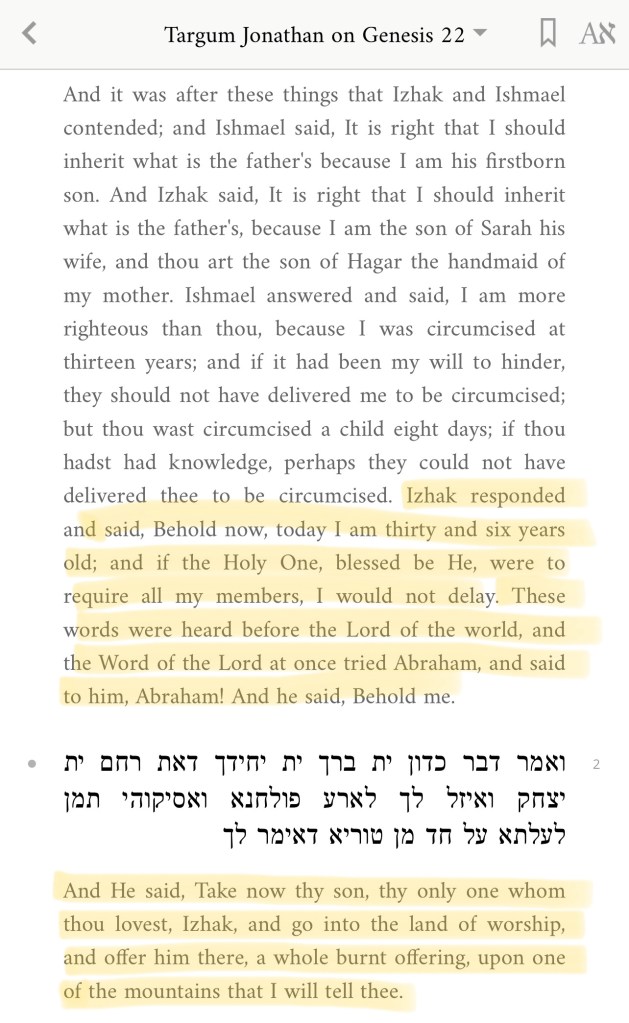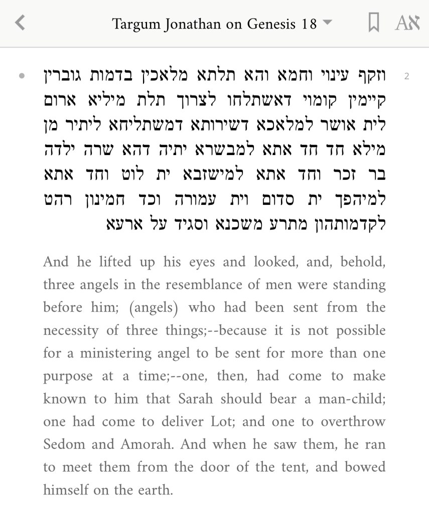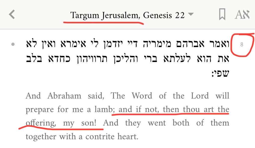 As I was cruising down the road from Chicago, Illinois to Kansas City, Kansas; I was listening to a PDF file via audio reader called: Voice Dream that I recently just downloaded from the App Store. The PDF was the book of Genesis chapters 18-22 in the Targum Of Pseudo-Jonathan (click here: targum.info). Moving forward, I found several parallels that I would like to show you. Below are some screenshots from Sefaria.org: