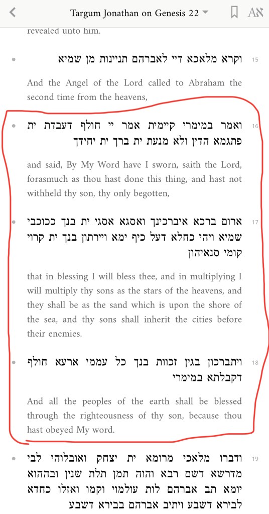 Isaac, Abraham’s son didn’t have to die for the sins of the world to be forgiven. God didn’t allow Abraham to kill his son. Instead, he stopped him, and promised that the peoples of the earth shall be blessed through the righteousness his son because Abraham obeyed the word of the AL SHDY “AL-SHih-dee” ΧΧβΧ©ΧΧβπ€π€ π€π€π€. I know I said, I shouldn’t have to put a screenshot of the New Testament parallel, but just in case…