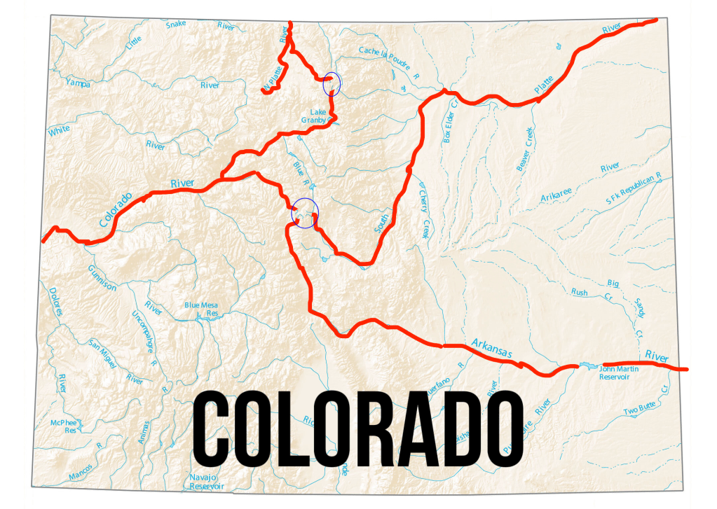 This map shows the headwaters of the North Platte River, and the Colorado River in the first circle near the top. The second circle contains an additional headwater source of the Colorado River called the Eagle River, the headwaters of the South Platte River, and the Arkansas River.