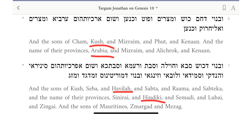 Noteπ: Hindiki is the same as Havilah because we read here in Genesis 10:7 starting with the Aramaic Targum of Pseudo-Jonathan