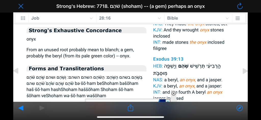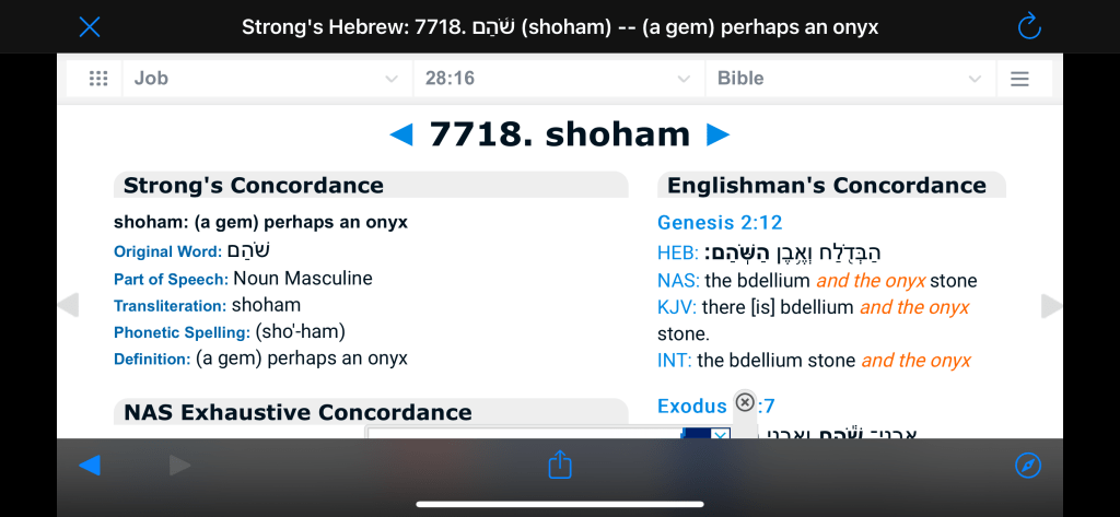 The word used in the Hebrew scriptures for onyx is Χ©ΧΧ, but Strongβs Exhaustive Concordance seems to be conflicted between beryl and onyx. In the Aramaic Targum of PSJ they use burlyn or ΧΧΧ¨ΧΧΧ for beryl with no mention of onyx. Which ever stone it could be, they both can be found in the state of Colorado.