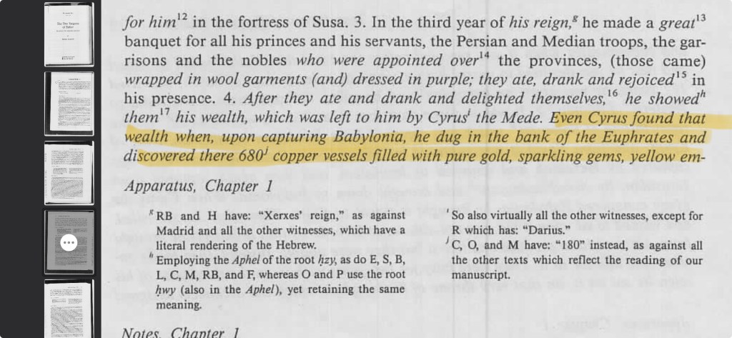 βEven Cyrus found that wealth when, upon capturing Babylonia, he dug in the bank of the Euphrates and discovered there 680′ copper vessels filled with pure gold, sparkling gems, yellow emeralds, and other types of gems;β¦β