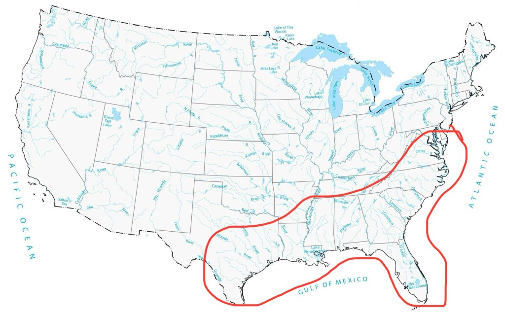 DIRECTION: SOUTH – The Mississippi River flows primarily south. It begins at Lake Itasca in northern Minnesota, which is higher in elevation than the surrounding areas allowing rainfall and run off to accumulate. Combined with nearby springs that feed into the lake, it consolidates creating the headwaters of the Mississippi river, and flows southward through the central United States until it empties into the Gulf of Mexico.